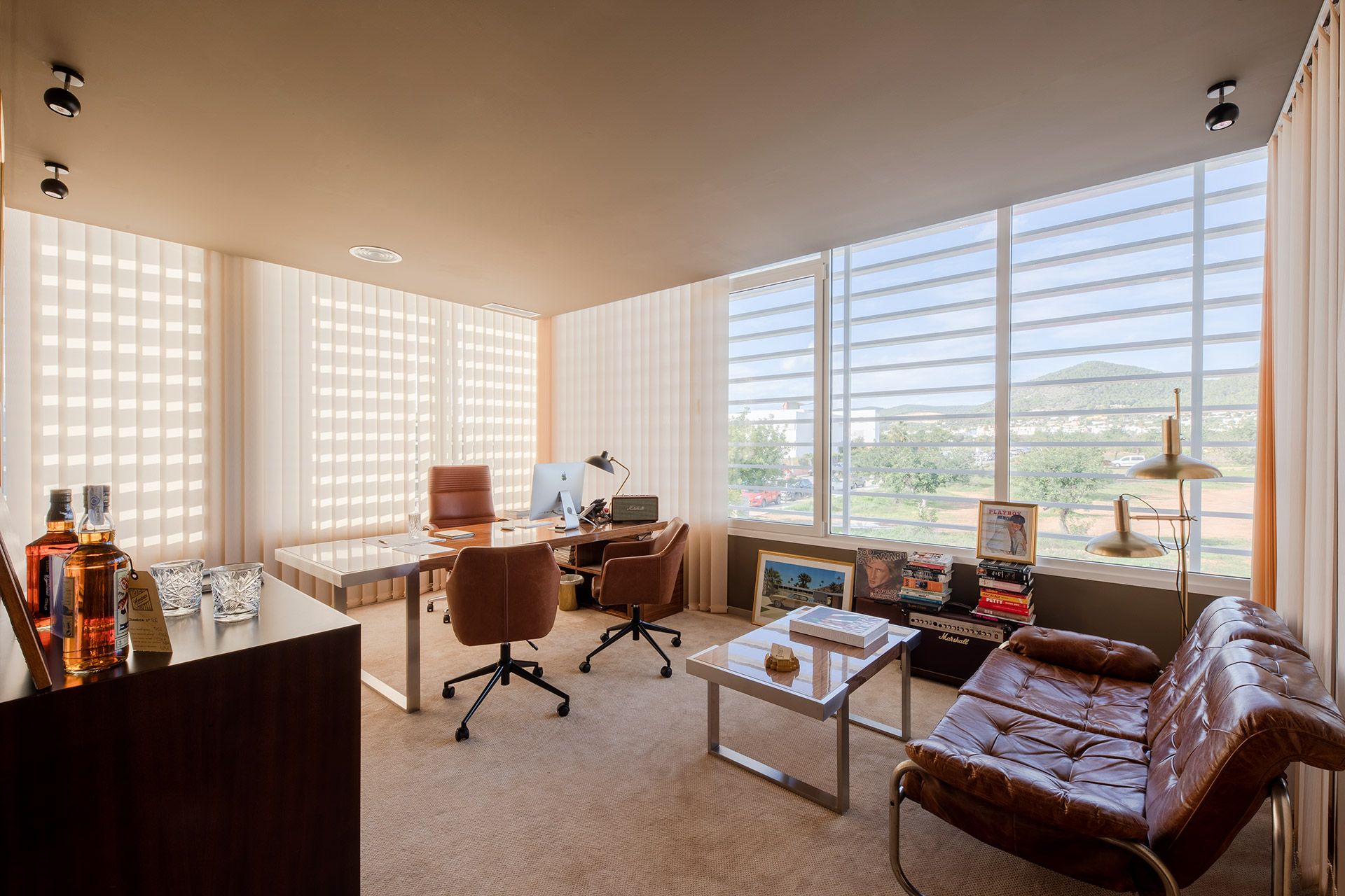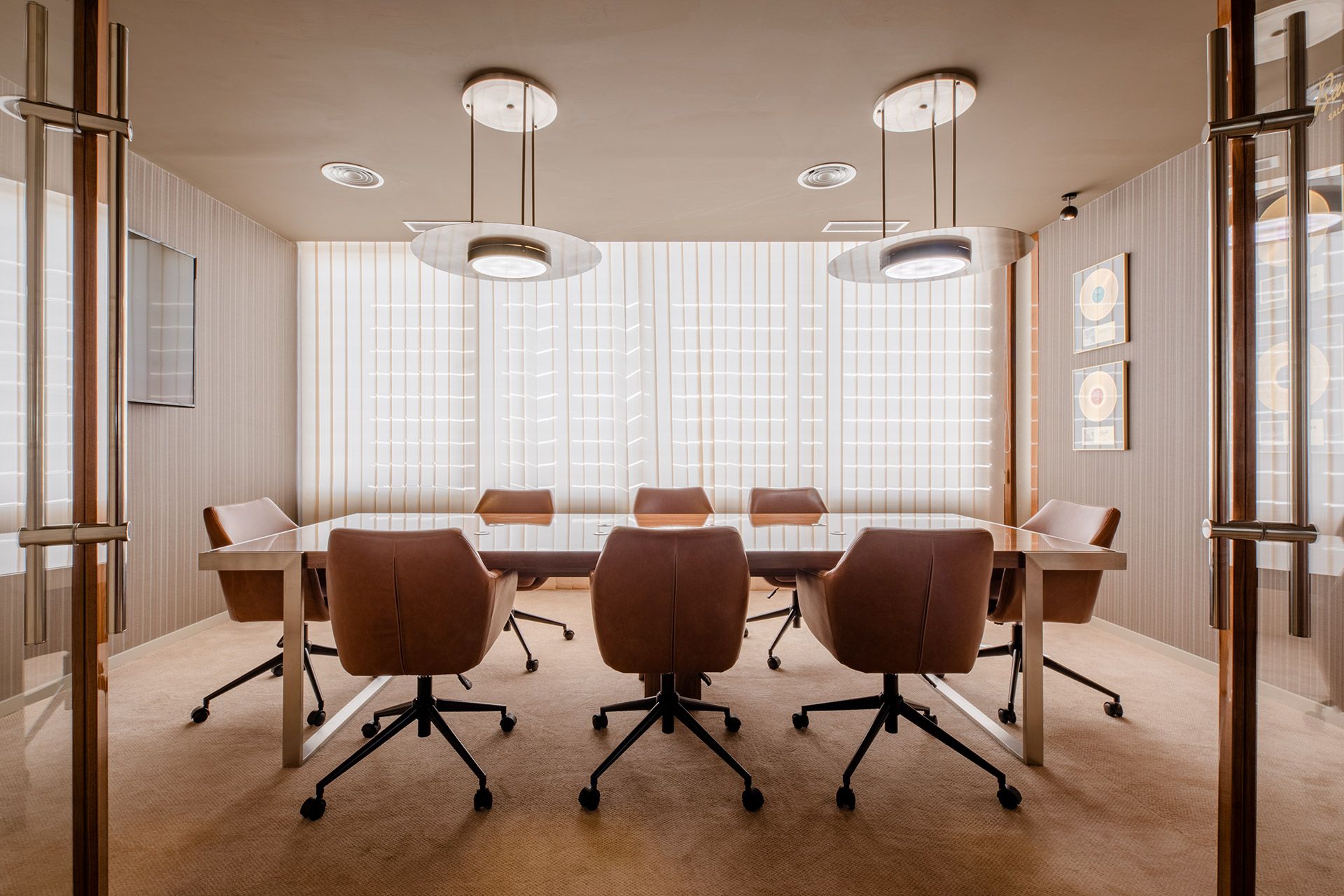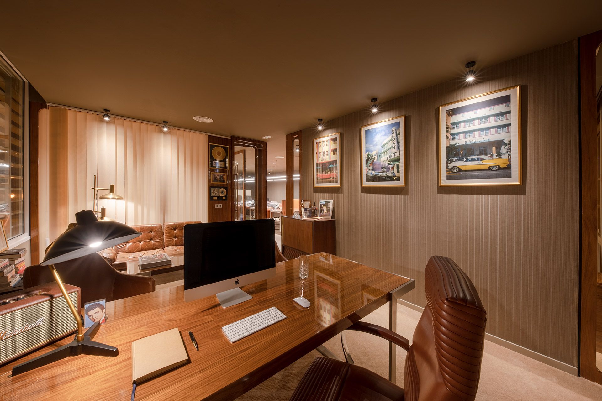 Adentrarse en las oficinas de Concept hotel group es como hacer un viaje en el tiempo hastalos años ’70 de la serie Vinyl (Martin Scorsese y Mick Jagger), a una Nueva York efervescente y artística llena de piezas de diseño y arte contemporáneo.Predominaban los muebles de madera brillante, los asientos de piel y las lámparas futuristas y metalizadas”. “Los detalles como la barra de la entrada, las cristaleras o las lamas de las cortinas vienen de otra gran película: Wall Street, el dinero nunca duerme (Oliver Stone). Másde mediados de los años 80 pero que se integran a la perfección en la estética”.