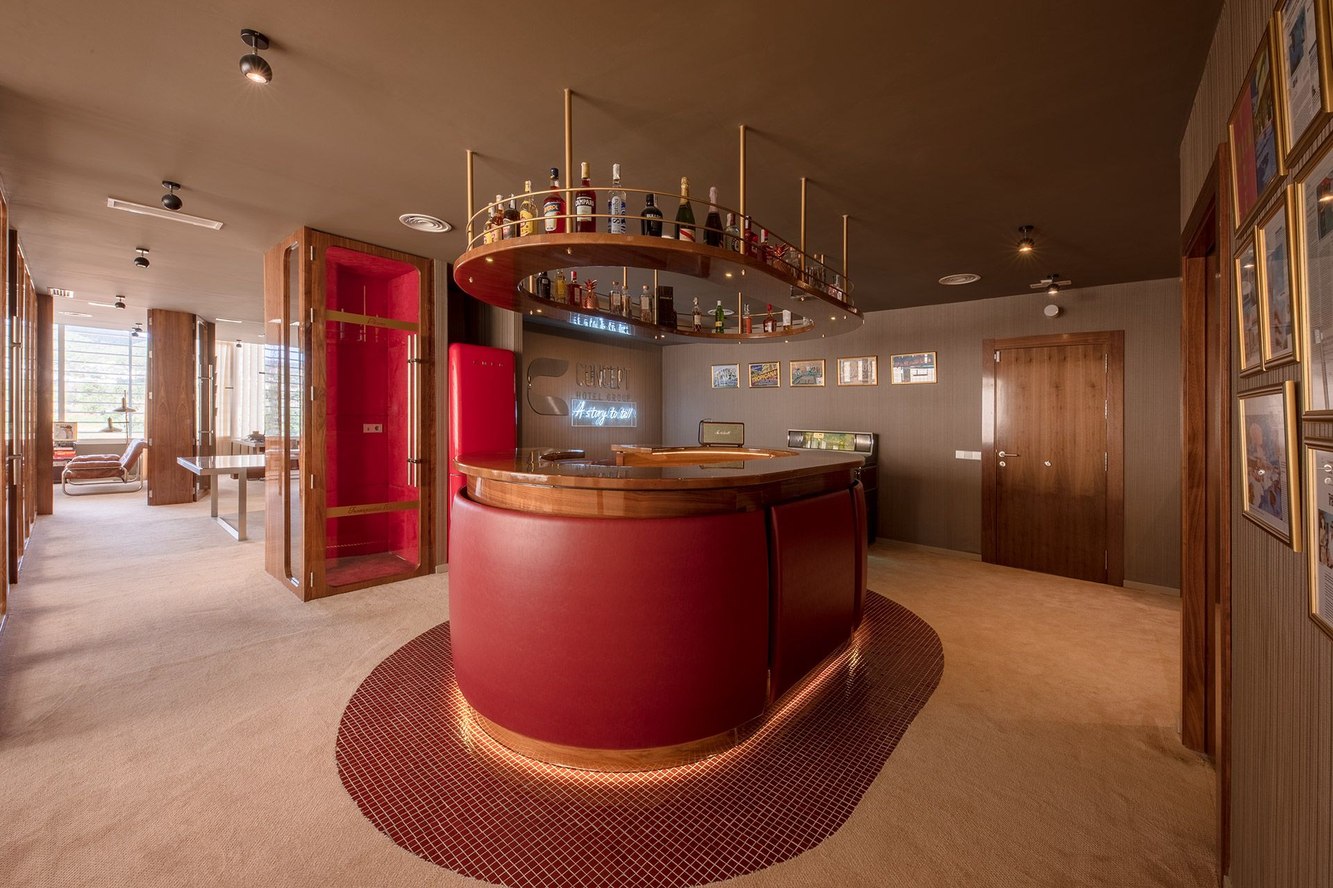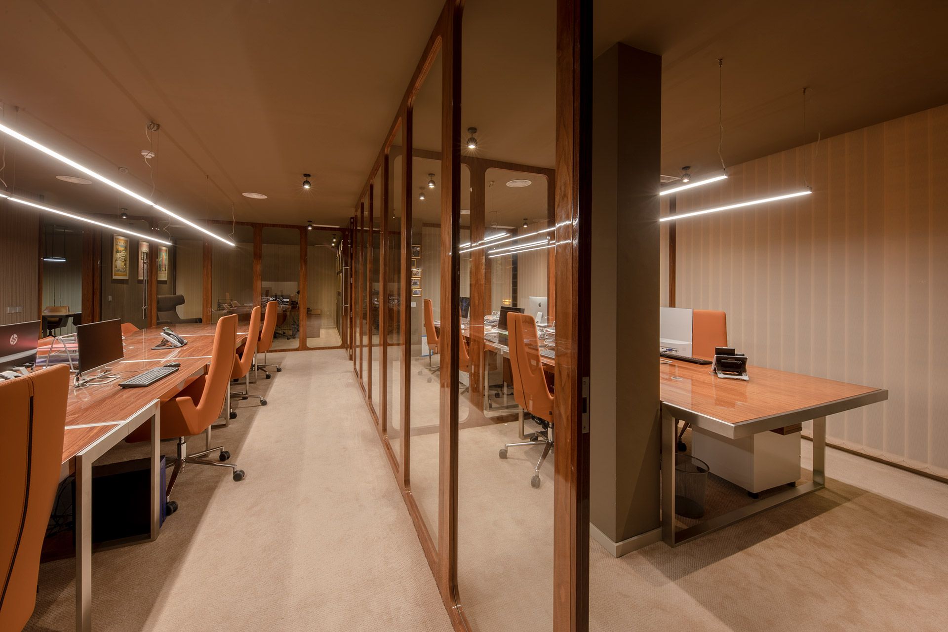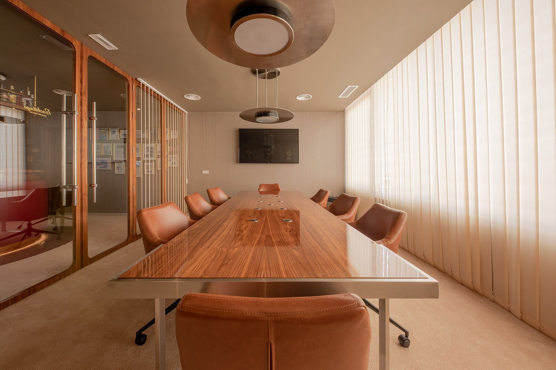 Adentrarse en las oficinas de Concept hotel group es como hacer un viaje en el tiempo hastalos años ’70 de la serie Vinyl (Martin Scorsese y Mick Jagger), a una Nueva York efervescente y artística llena de piezas de diseño y arte contemporáneo.Predominaban los muebles de madera brillante, los asientos de piel y las lámparas futuristas y metalizadas”. “Los detalles como la barra de la entrada, las cristaleras o las lamas de las cortinas vienen de otra gran película: Wall Street, el dinero nunca duerme (Oliver Stone). Másde mediados de los años 80 pero que se integran a la perfección en la estética”.