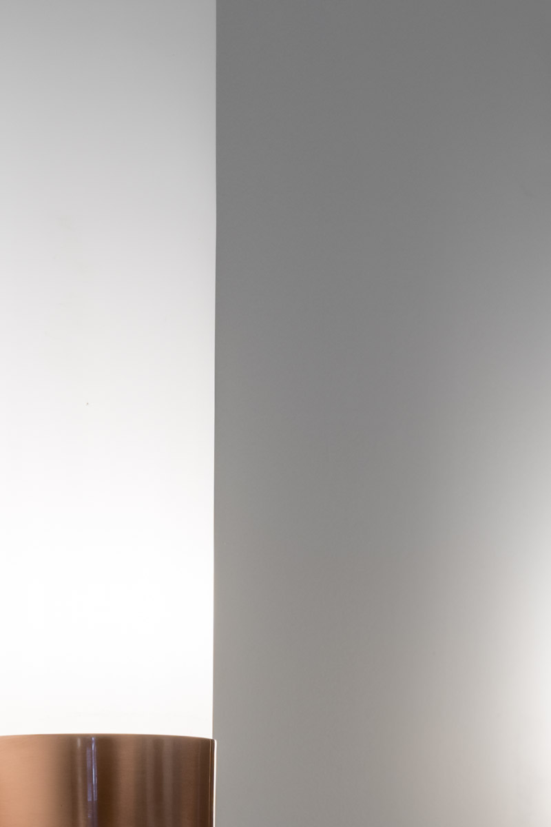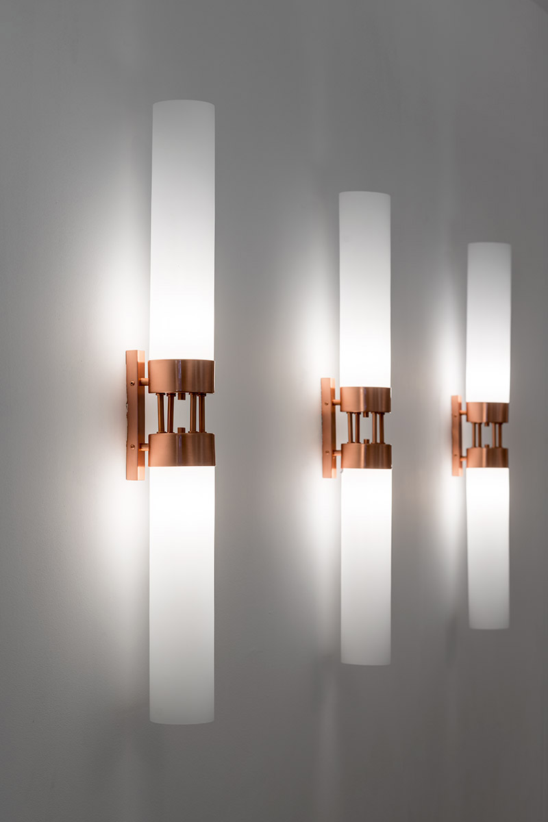 Aplique de soporte metálico en acabado de cobre brillante con dos piezas cilíndricas de cristal de 40 cm de altura cada una en la parte superior e inferior