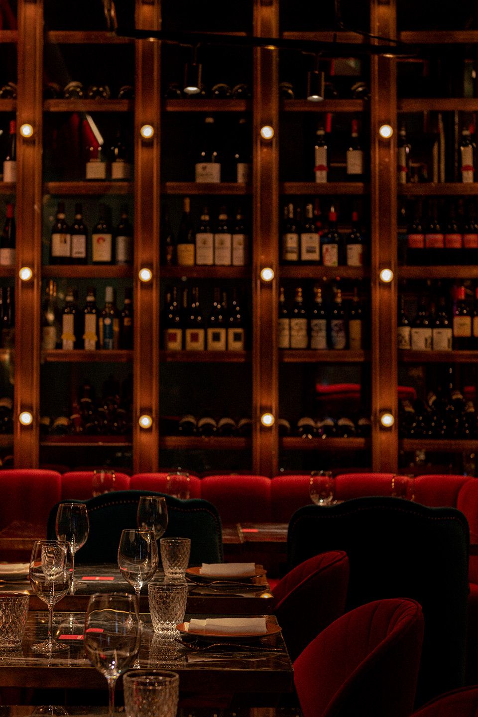 Elegante y nostálgico el espacio pretende transportar al comensal al mundo del espectáculo con cortinas de terciopelo, colores rojos, espejos y una cuidada iluminación que crean una atmósfera teatral.
